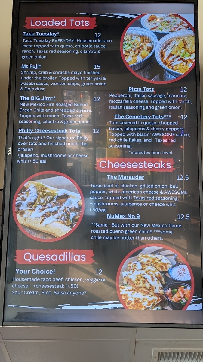 Tater tots typically topped with queso, chopped bacon, jalapeños, cherry peppers, drizzled with blazin awesome sauce, and sprinkled with red chile flakes.